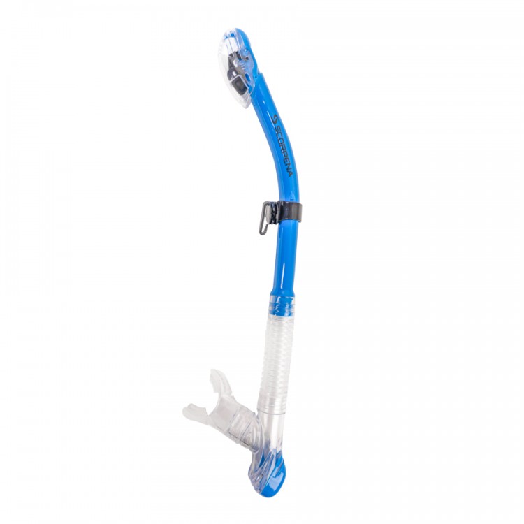 Scorpena K series snorkels have a bottom by-pass valve and a top "dry" valve. It is perfect for snorkeling, diving and spearfishing in clear water. The mouthpiece is very flexible and does not interfere when not in use.