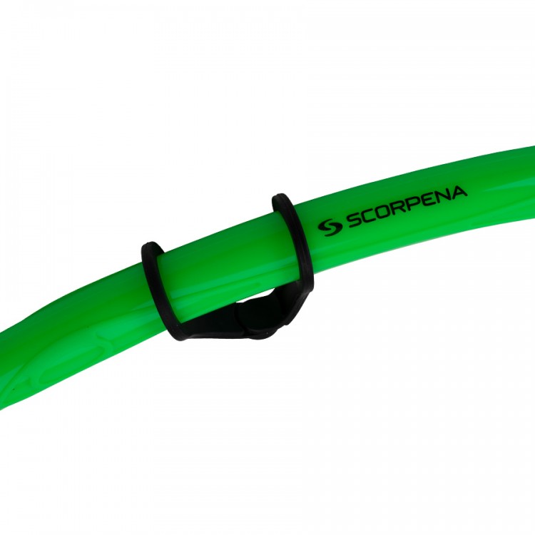 Scorpena B4 is made of colored soft technopolymer and the mouthpiece is made of silicone, which does not cause allergies in contact with skin. The snorkel has a removable mouthpiece in the color of the body and a universal black mask mount.