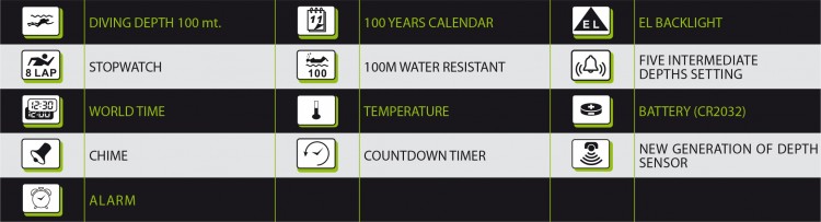 Depth gauge 100 mt. Surface time Diving time Water temperature New depth sensor with the fastest and most accurate reading, with updates at intervals every 0.5ms Storage of diving data Alarm setting: one for max diving depth one for max diving time Five intermediate depths Larger strap for better adaptability Stop any other function when in dive Kryptonite camouflage strap Salvimar Pattern - Lisainformatsioon