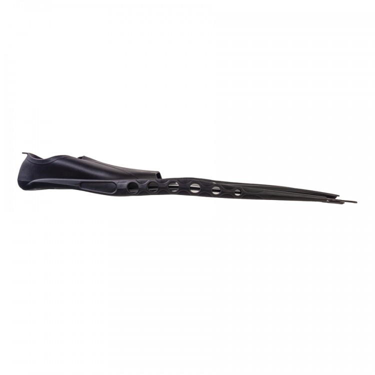 The fins feature colored plastic blades. Rubberized edges protect the blades from cracking with minor impacts, thereby extending their lifespan. An interesting design solution aimed at improving the efficiency of the stroke is the flexible inserts in the blades. The central part of the blade is made of elastic rubber, forming a tunnel during the stroke that prevents water from flowing into the low-pressure zone (on the reverse side of the blade) through the side edges. This directs water towards the end of the blade, increasing stroke power and reducing energy loss by laminarizing the main flow. This design in the blades is referred to as the "tunnel effect." The lateral stiffness ribs ensure the most effective curvature of the blade during the stroke, and the holes in them reduce weight.
