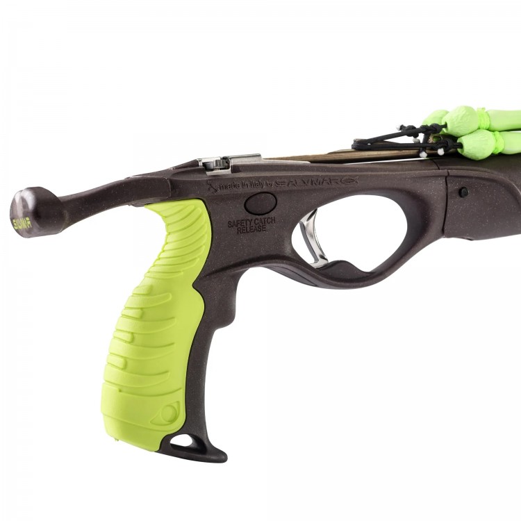 The Metal family spearguns from Salvimar come with a full 304 stainless steel release mechanism made with MIM technology. The anodized aluminum barrel is both light and strong, thanks to its sleek profile that also makes branding super easy. The handle is ergonomically shaped for a comfy grip and, like the muzzle, is made from 30% fiberglass-reinforced nylon. It comes ready with ø16mm double elastics and a 174ph stainless steel shaft.